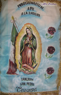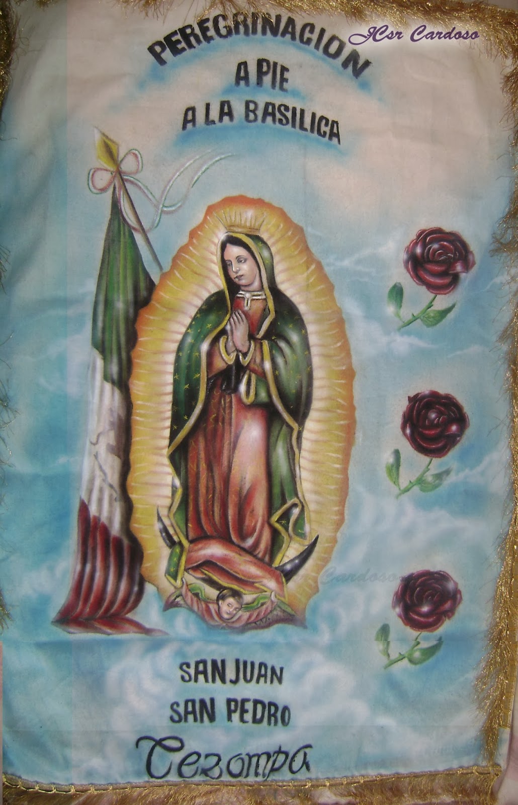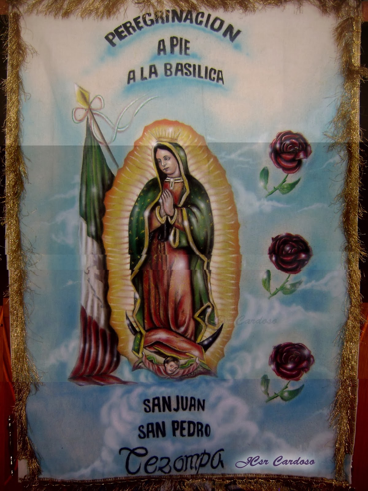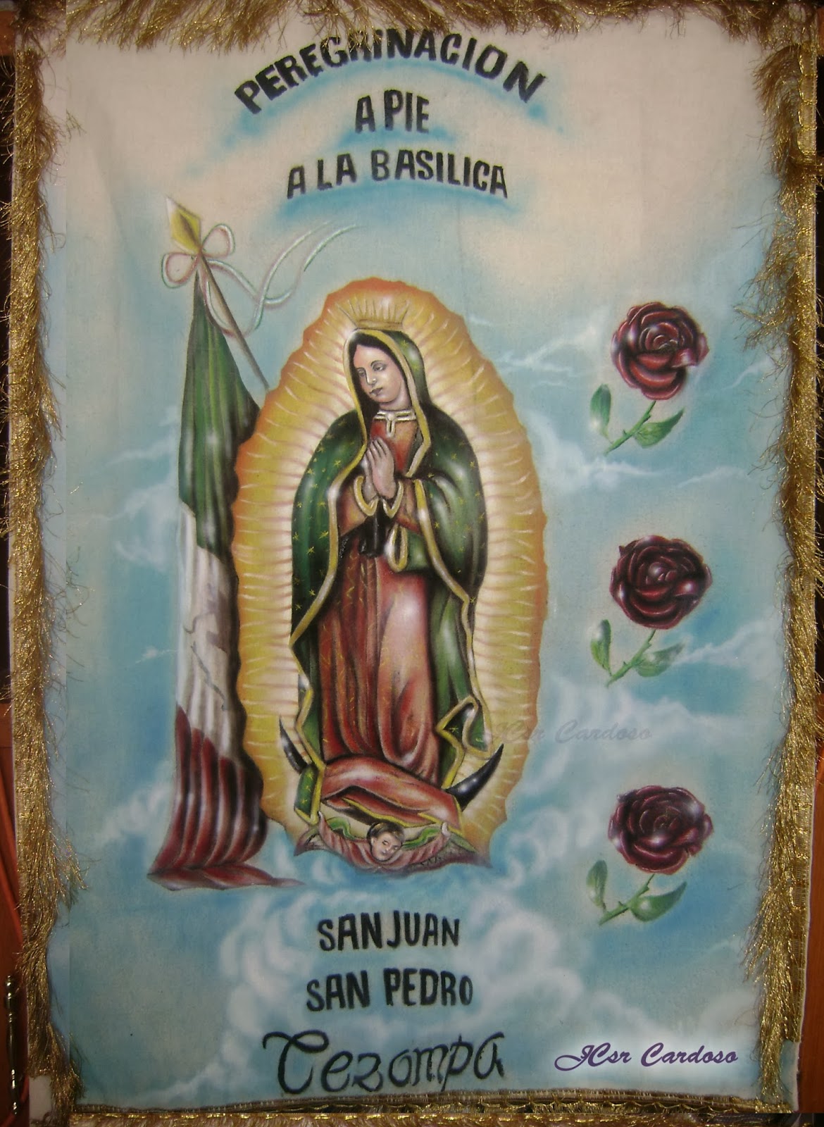 En la siguiente publicación se muestra fotos de la virgen de Guadalupe, este es una representación mas de pinturas al oleo dedicadas a la reina de México, la pieza artística esta pintada en oleo sobre tela complementado con ligeros toques en técnica aerografia, en si este bonito detalle es un estandarte utilizado comúnmente en peregrinaciones católicas.